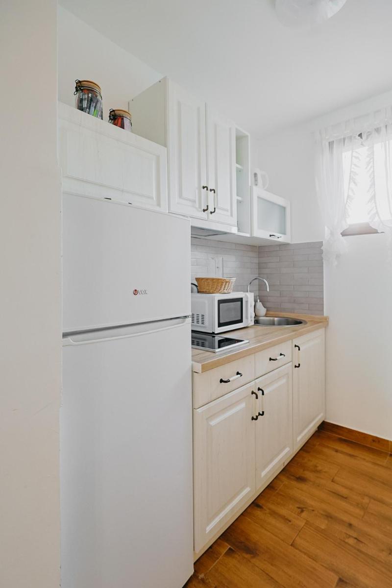 L'appartement propose un espace de vie spacieux de 52 mètres carrés équipé d'une cuisine bien approvisionnée, y compris une machine à micro-ondes et de café, qui permet aux résidents de préparer des repas et de profiter des boissons dans la salle à manger commune à l'extérieur. Il comprend également une salle de bain entièrement rénovée avec des luminaires et des pantoufles modernes, améliorant le confort pendant les séjours.