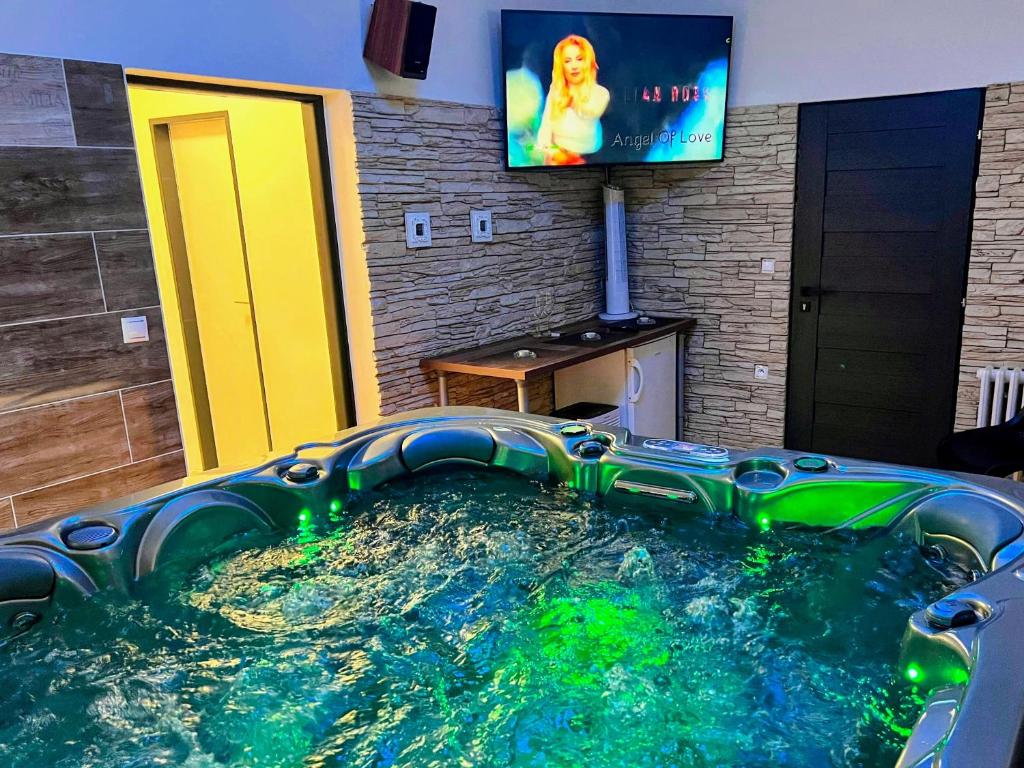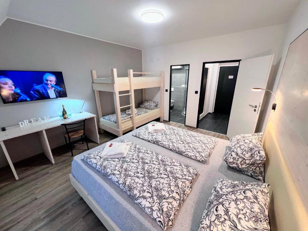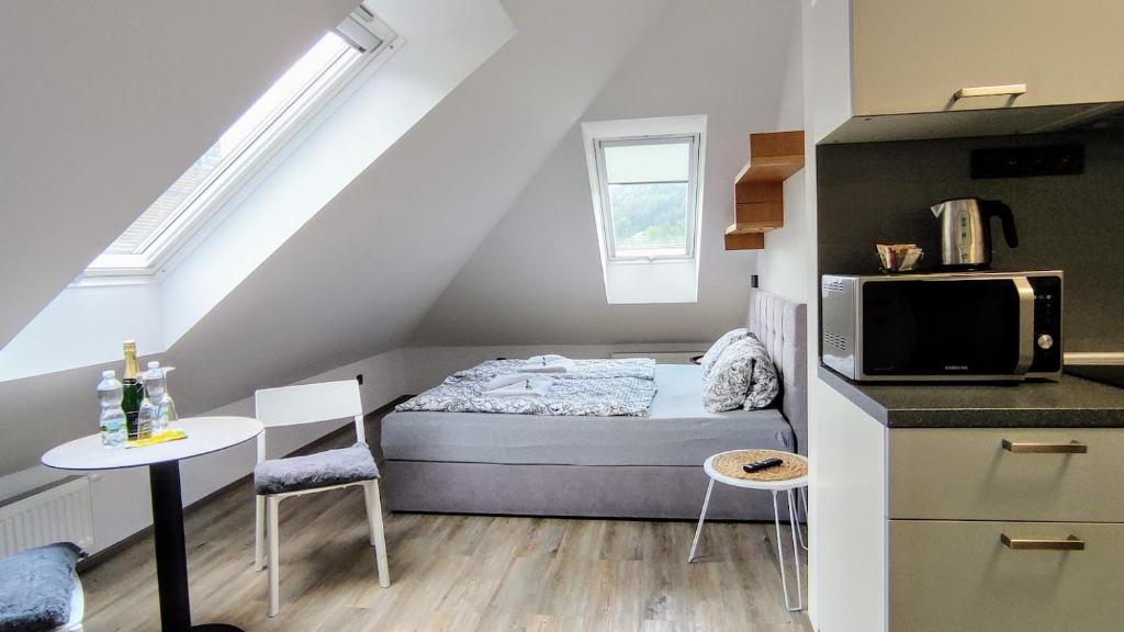La pension de Grand Harrachov à Harrachov offre des hébergements confortables avec un appartement spacieux avec une salle de bain privée, une climatisation et une terrasse. Le Wi-Fi gratuit assure une connectivité ininterrompue. L'appartement possède un accès de ski à porte, un bar et un salon, ainsi que des installations de cuisine partagées, un coin salon extérieur et une salle de jeux. Les clients savourent quotidiennement une variété de délicieuses options de petit-déjeuner, y compris des choix continentaux, buffet, végétariens et sans gluten. Idéalement situés à 71 km de l'aéroport de Pardubice, les clients peuvent explorer des attractions à proximité telles que Szklaki Waterfall (7,5 km), Ještěd (29 km), et plus encore.