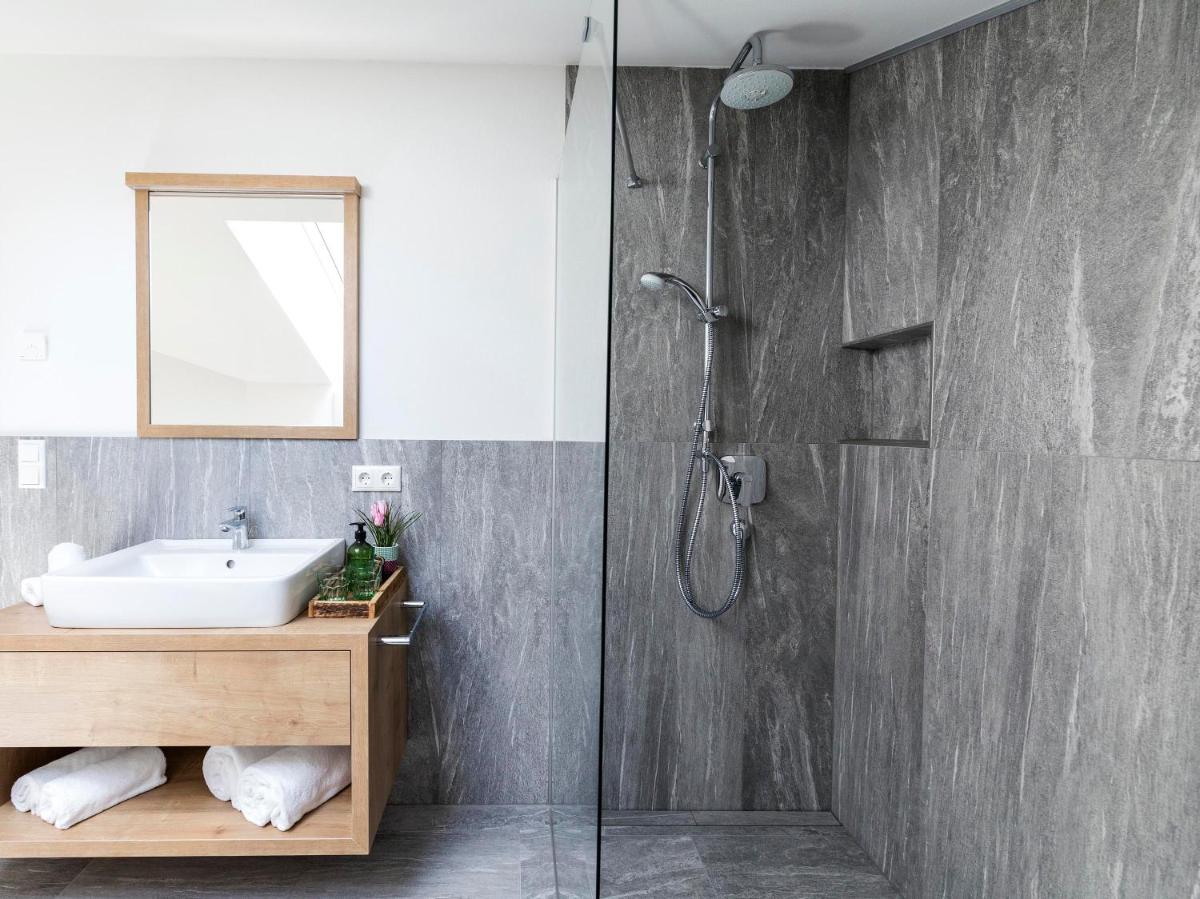 - Salle de bain de douche: une salle de bain confortable et moderne avec de nombreuses options de rangement.