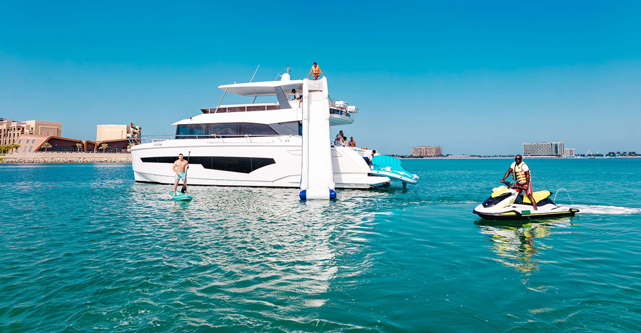 Découvrez un voyage idyllique à bord d'un yacht luxueux à Ras al-Khaimah, où vous pouvez vous adonner à une expérience culinaire tranquille en bord de mer avec un barbecue et des boissons rafraîchissantes.Immergez-vous dans une aventure amusante en glissant sur une diapositive gonflable, en explorant les eaux cristallines par la plongée en apnée et en écoutant des airs apaisants.